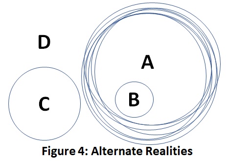 Figure 4 represents a community’s reality, but with a couple types of deviations from that reality, or what we diagnose as mental deficiency or illness. Circle B represents someone who can only perceive a small portion of the greater shared social reality (A). Person B has difficulty being fully functional in the larger social context (A) because so much of it is unreal to him or her.