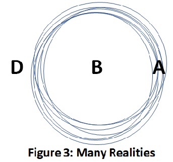 Figure 3 represents the combined realities of many people, such as a community or society, where the overlapping circles, A, represent what is real to representative members of that group. Area B represents their shared reality, or what they all agree is real and are capable of understanding and attending to. Area D represents what is unreal to everyone in this society. Whatever exists in area B establishes the norms for this society.