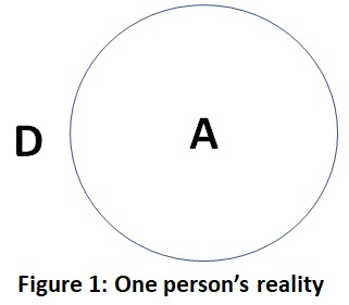Whatever falls into area D for a given individual is outside of their conscious reality. Just because what exists in area D is unreal for one person, however, does not mean it does not exist, only that everything in area D is unavailable to or unconscious for that person. Education, life experiences, cross-cultural and spiritual training can expand area A into greater parts of area D.