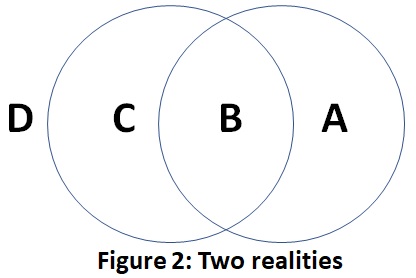 Figure 2 represents the realities of two people, A and C. Area B shows where their realities intersect as a shared reality. Area D is outside of reality for both people. Because their shared realities include a relatively small portion of their individual realities, these two people likely share little in common. They can increase their shared area, B, through the expansion of their circles of awareness into more of the other person’s circle.