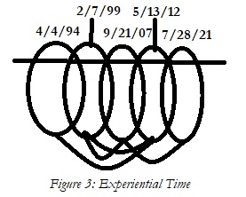 Figure 3 introduces (if awkwardly) a couple of ways we might visualize experiential time in relation to chronological time. The five circles represent 5 different days over 27 years, the first on April 4, 1994, and the last on July 28, 2021. In one example, the straight line through the circles could represent a particular occurrence, say reconnecting with a long-time friend we seldom see. The 5 points where the line intersects a circle, while not connected sequentially in days or years, are connected by the commonality of the experience with one’s friend on each of those five days, all of which flows from and connect to the origins of the friendship.
