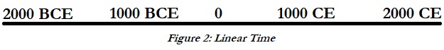 Another common way in which chronological time is illustrated is linearly (Figure 2). Pictured in this way, we visualize time as progressing along a straight line from the past to the future. Linear time is marked by the passing of days and years, but along a horizontal axis instead of a circle. When visualized linearly, eternity extends without end, moving from left – the past – to right – the future. We assume, not necessarily correctly, that growth and change occur sequentially along the line, with points to the left being less developed, mature, or enlightened than points to the right.