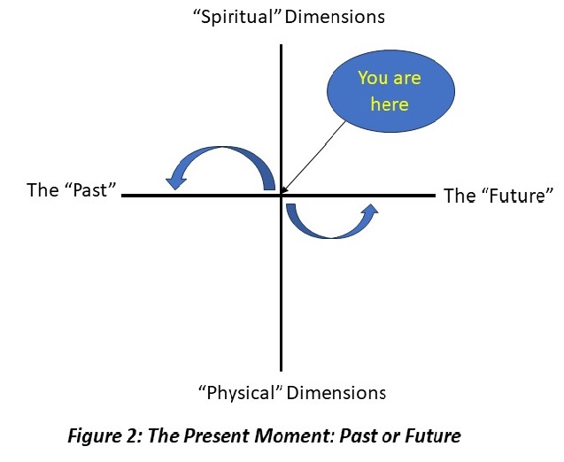 leading us to today and that points us toward possible futures. Figure 2 illustrates what happens when our conscious attention gets consumed with guilt and regret over past events or drifts into useless worry about events that may or may not happen in the future. The net result of either is the removal of our attention from the present moment, away from where life is occurring now. Only in the now can we do something about our circumstances. The vertical axis represents where our conscious attention is placed in time, so when we allow it to drift away from our current position in earth-time, we attempt to live either in memories (past) or imagination (future), neither of which can unite us to what is right here, right now.