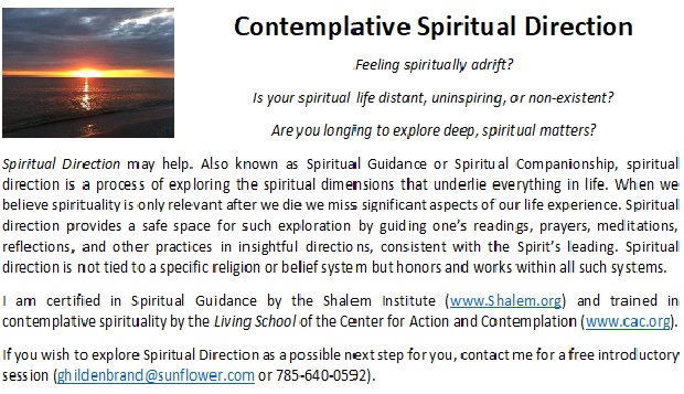 Spiritual direction is not psychological counseling in that it is not a treatment for serious mental illness. I am not trained in psychological counseling. Spiritual direction is based on the premise that our physical lives have underlying spiritual foundations. Spiritual direction explores those foundations and helps to make our daily lives healthier and more gratifying by exposing, honoring, and strengthening those foundations, as needed.